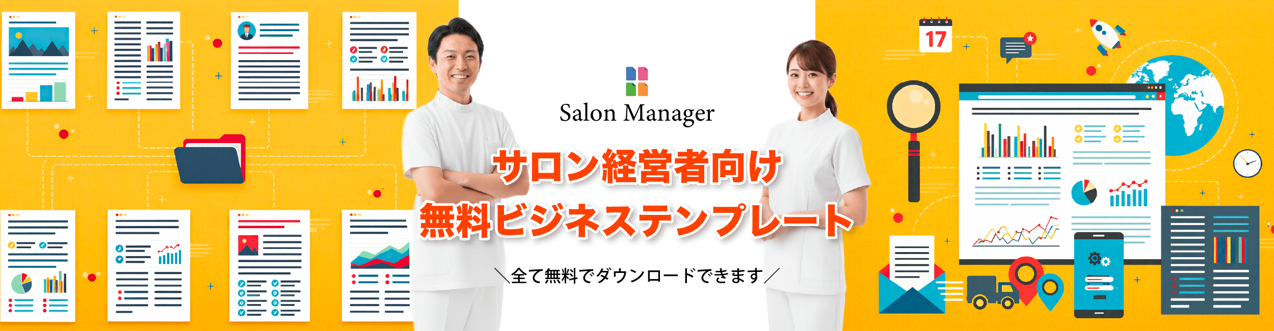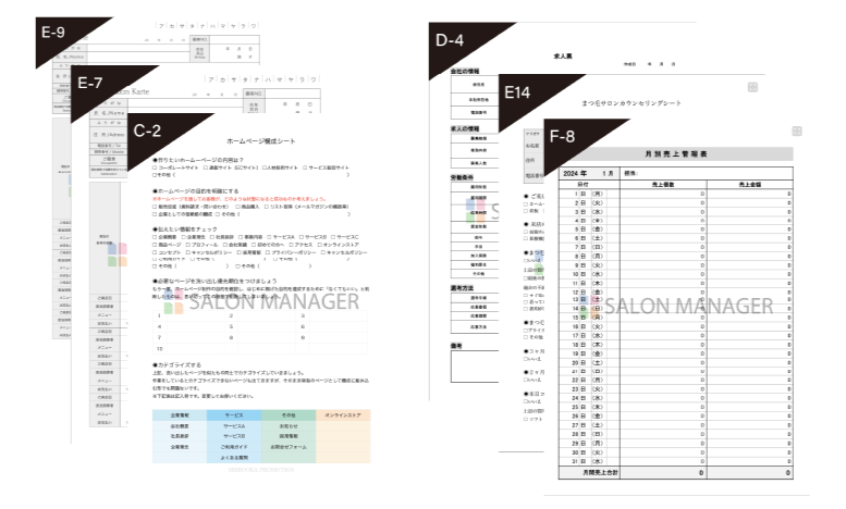 SALON MANAGERは、サロン・治療院経営に役立つテンプレートや資料を無料でダウンロードできるサービスです。売上管理表や事業計画書、採用関連書類、ブランディング資料、ホームページやLPの構成シートなど、現場ですぐに使える実務ツールを多数ご用意しています。
